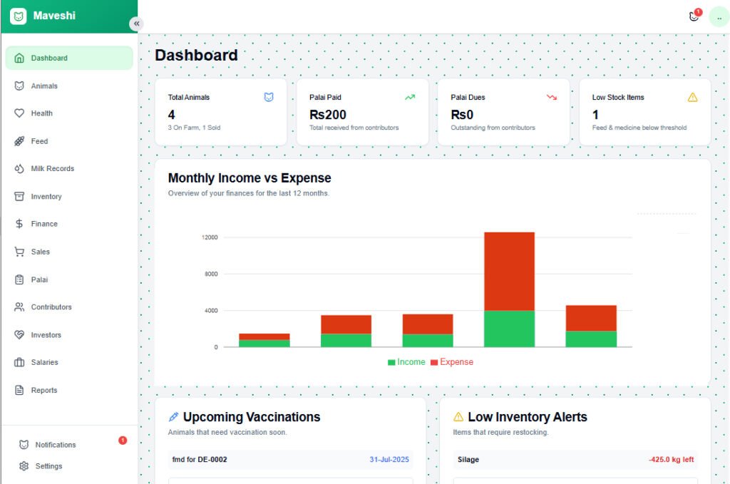 Maveshi Pakistan ka pehla complete livestock management software hai jo janwaron ke record, palai, doodh, dawai, sales, aur investor reports ko manage karta hai — sab kuch ek app mein.